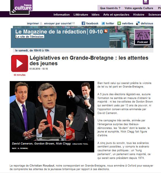 France Culture – Le magazine de la rédaction – Les élections britanniques (mai 2010)